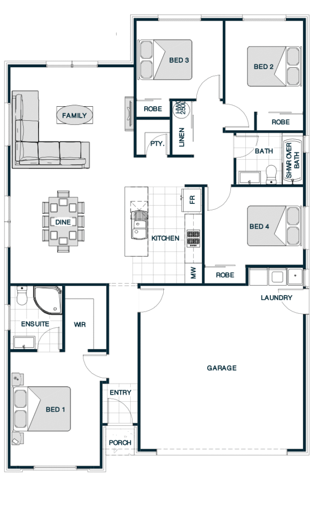 The Avon Gable roofline and brick exterior, this great value compact home utilises clean lines and efficient design to maximise the feeling of space within. Avon comes standard with beautiful open plan living areas, central kitchen, a double garage, and a generous master suite with all the trimmings. Bedrooms are serviced by a separate bathroom suitable for the whole family. This home has many options to customise to your lifestyle including alfresco dining choices.
