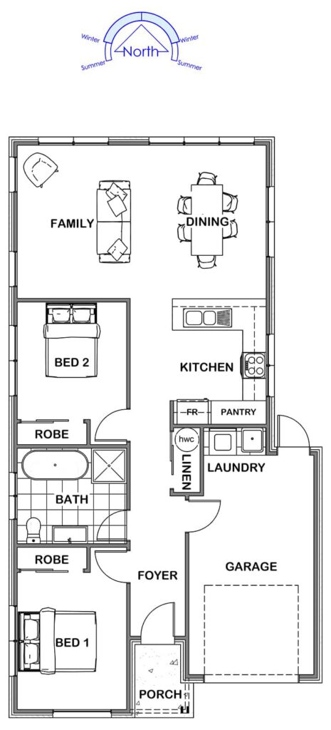 The Azure Hip combines classic elegance with modern living. Its timeless hip roof complements the balanced proportions of the home, offering excellent street appeal. Inside, the layout is designed for family living with well-zoned spaces that promote both togetherness and privacy. The open-plan kitchen, dining, and living areas flow to a sheltered alfresco, ideal for outdoor entertaining. The master suite is a private retreat with an ensuite and walk-in robe, while the additional bedrooms are grouped around a central activity room and bathroom.