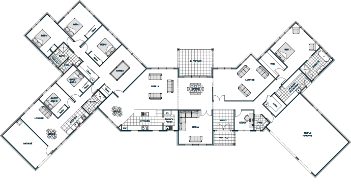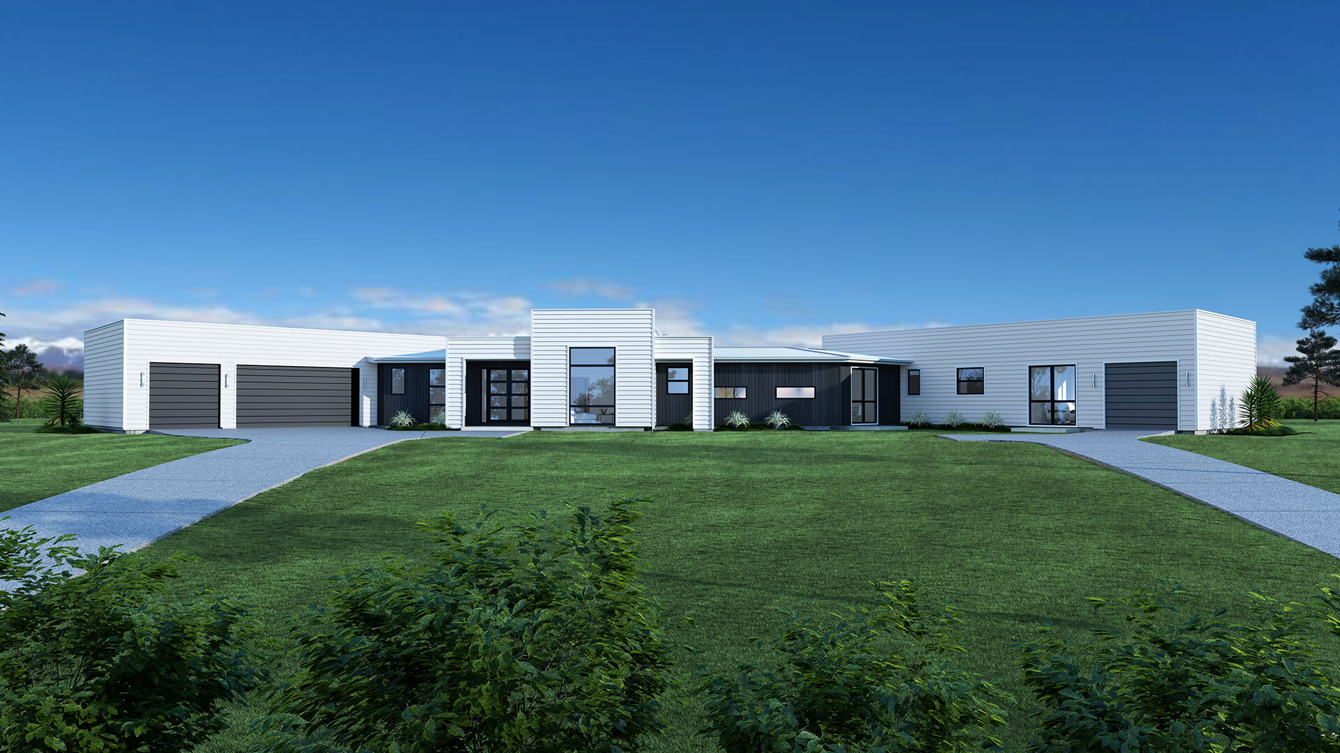 The Castle Park Mono is a modern,bold home featuring cube architecure to create strong clean lines, simple and strong. It is an expansive home designed for those who love to entertain and live large. With floor plans ranging from 365m to 496m , it includes 4 to 6 bedrooms, 3.5 bathrooms, and up to 4 living areas. Its distinctive layout features wings that curve inward, creating a sense of shelter, privacy, and architectural drama. This home is an entertainers dream with formal and casual dining options and great indoor, outdoor flow.