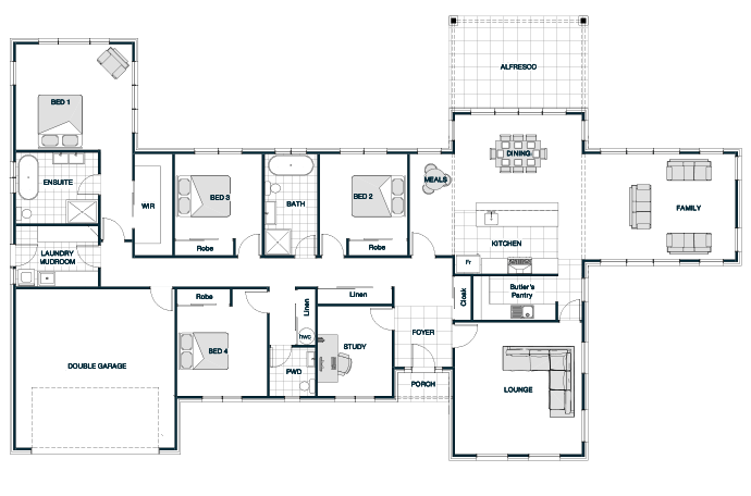 The Clevedon with a Hip roofline offers timeless elegance and a low-profile silhouette, ideal for rural or lifestyle settings. This spacious home combines classic architectural form with modern family functionality, featuring multiple living areas, a sun-filled master suite, and seamless indoor-outdoor flow. The hip roof enhances its stately presence while providing excellent weather protection and energy efficiency