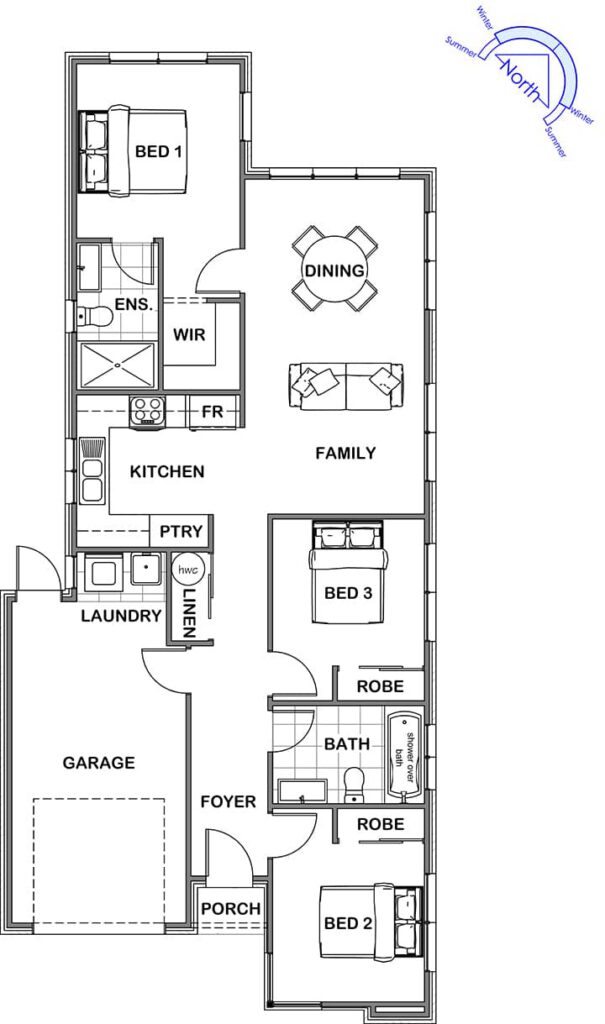 The Corso is a compact home with a clever layout that maximises every square metre. A combination of gable and hip rooflines adds a classic touch with modern appeal. Inside, the central kitchen connects seamlessly to open-plan living and dining, creating a warm, social hub. The master suite is privately positioned at the rear, while two additional bedrooms are tucked away at the frontóideal for families or downsizers. A perfect match for narrow or compact sites without compromising comfort.