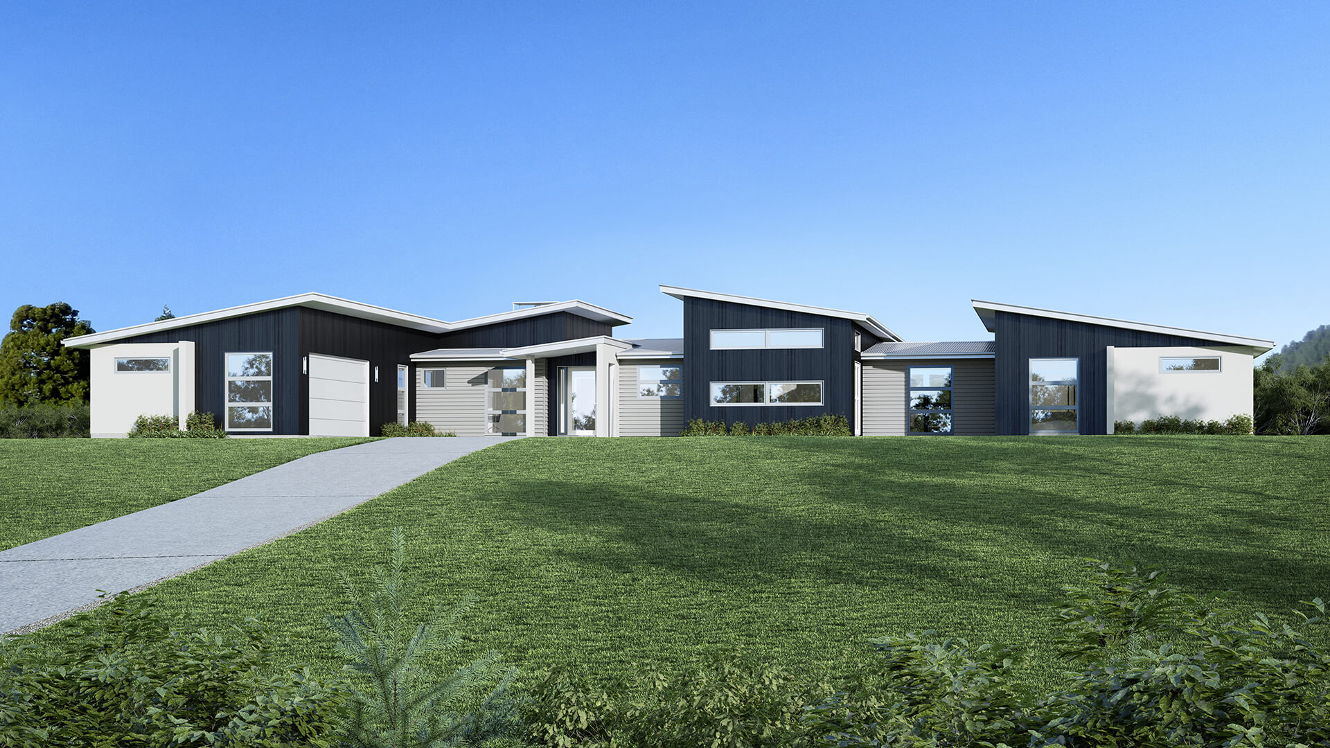 The Fernvale with a Mono roofline brings a modern, streamlined look to a family-friendly layout. The single-sloped roofline creates striking interior volumes and allows for large windows that brighten the open-plan living and dining areas. With five bedrooms and flexible living zones, this design suits contemporary lifestyles and varied site conditions