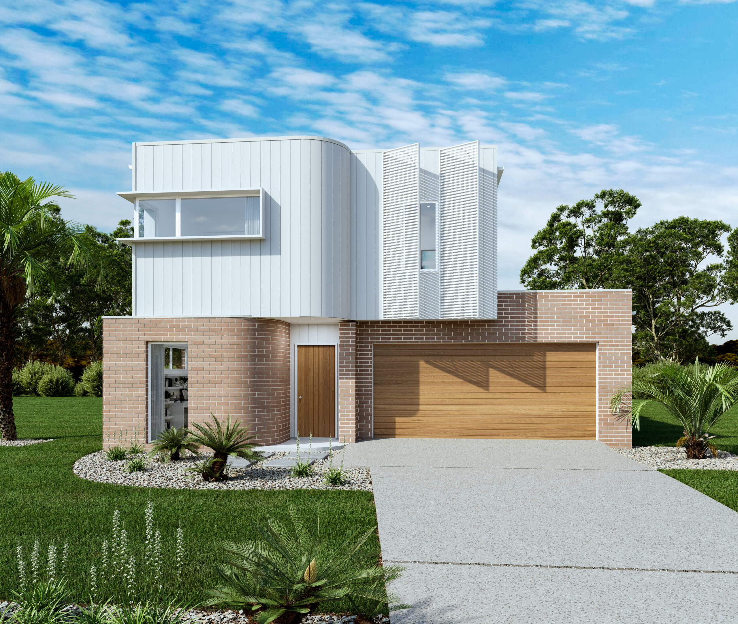 Palm Springs inspired, this value packed family home is big on style and great for those compact sites. With an open study flowing off the foyer, to the open plan lounge and main living area to the rear, the layout of this design is all about catching natural light and feeling as open as possible. Upstairs the family bedrooms reside, with a private bathroom and separate master suite featuring its own ensuite and walk in robe, storage and privacy are everywhere you need.