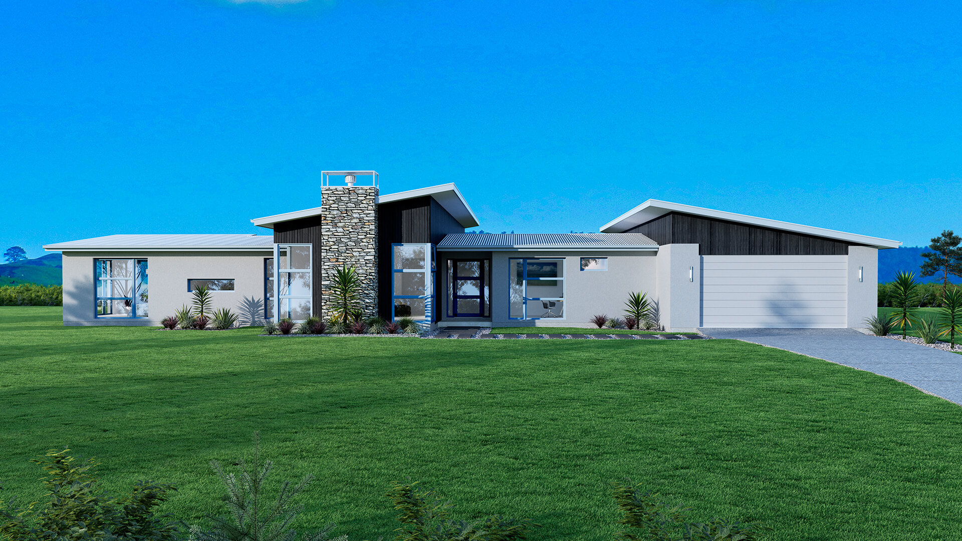 The Kawarau with a Mono roofline delivers a sleek, modern profile and spacious interiors. The single-sloped roof allows for soaring ceilings and large windows that brighten the open-plan living areas. With four bedrooms, including a master suite, and versatile spaces for family needs, this design suits contemporary lifestyles