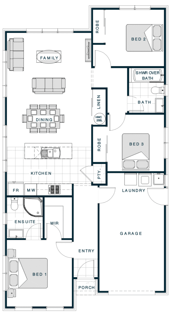 The Margate Hip Roof plan combines a durable, four-sided roof design with a smart, open layout that encourages easy living. This plan includes three comfortable bedrooms and versatile living spaces, designed to adapt to your family's needs. The hip roof adds a refined, balanced silhouette that enhances curb appeal while offering excellent protection from the elements. Its practical and stylish design makes it a reliable choice for lasting comfort and style.