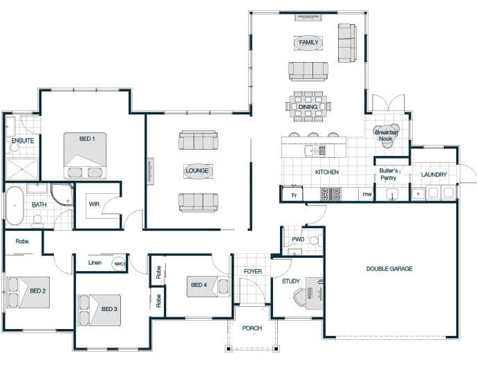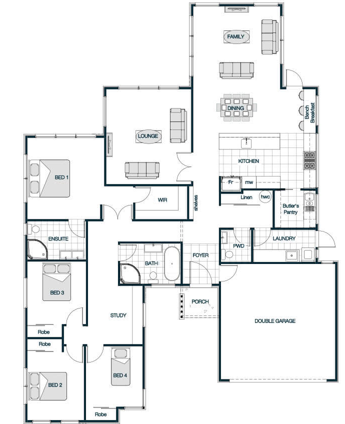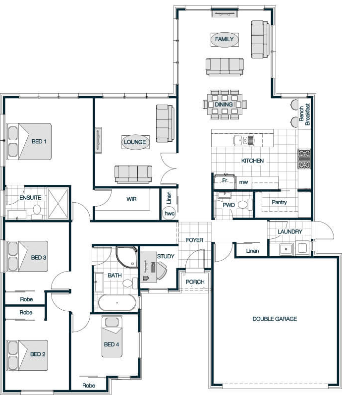 With its classic pitched roof, the Medbury Gable Roof plan brings traditional warmth combined with modern practicality. Vaulted ceilings in key areas elevate the sense of space and light, creating an inviting atmosphere throughout. The layout is thoughtfully designed with multiple living zones and generously sized bedrooms, making it ideal for families who value both comfort and style. The timeless gable roof adds character and charm to this beautifully balanced home.