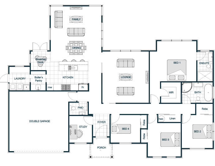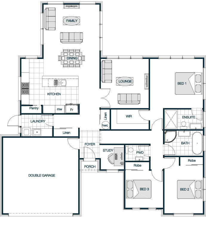 The Medbury Hip Roof plan features a sturdy, elegant roof that complements a well-considered floor plan. Designed for enduring style and comfort, the home offers spacious living and comfortable bedrooms. The hip roof not only enhances the homeÃs classic appeal but also provides excellent protection from the elements. This version strikes the perfect balance between functionality and aesthetic, ideal for those seeking a reliable and stylish family home.