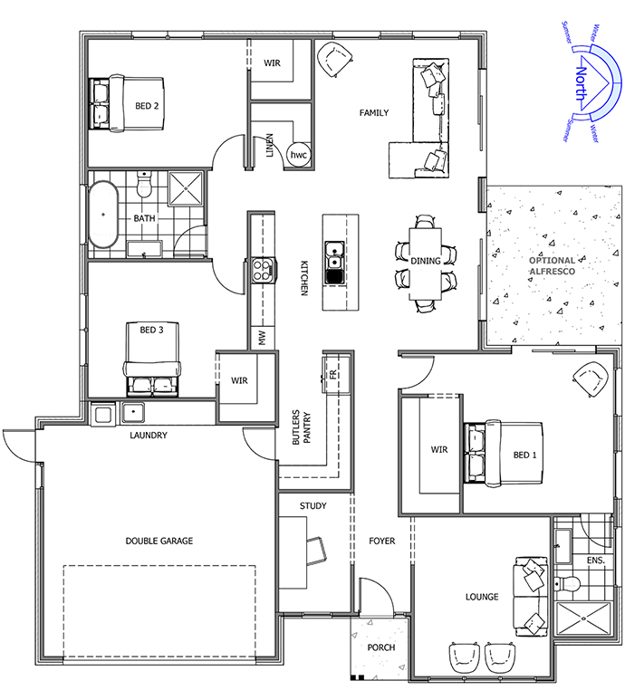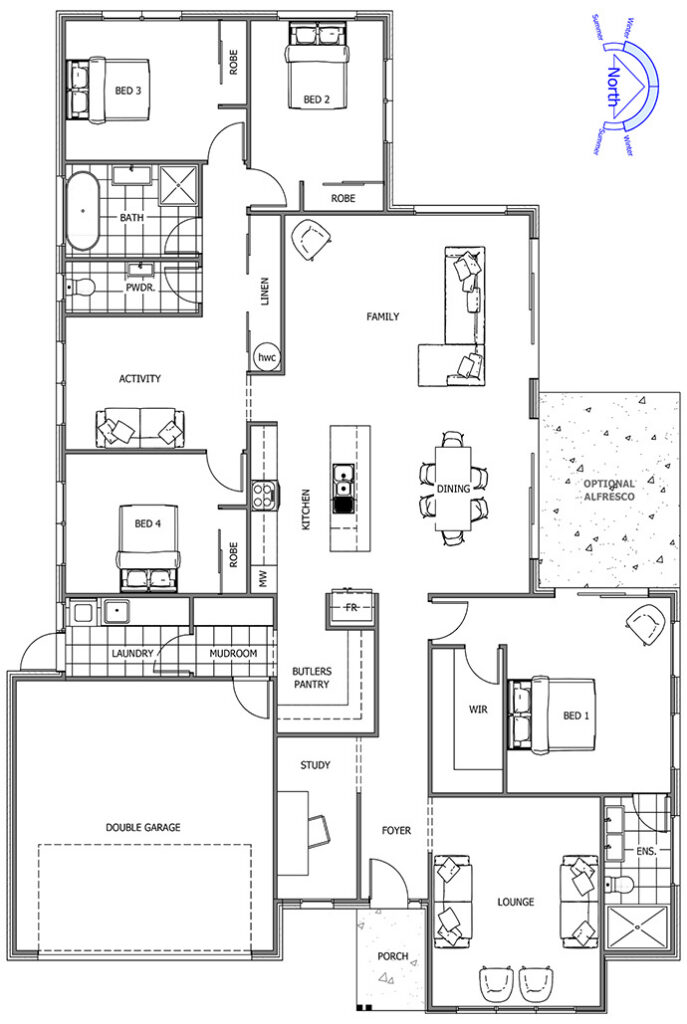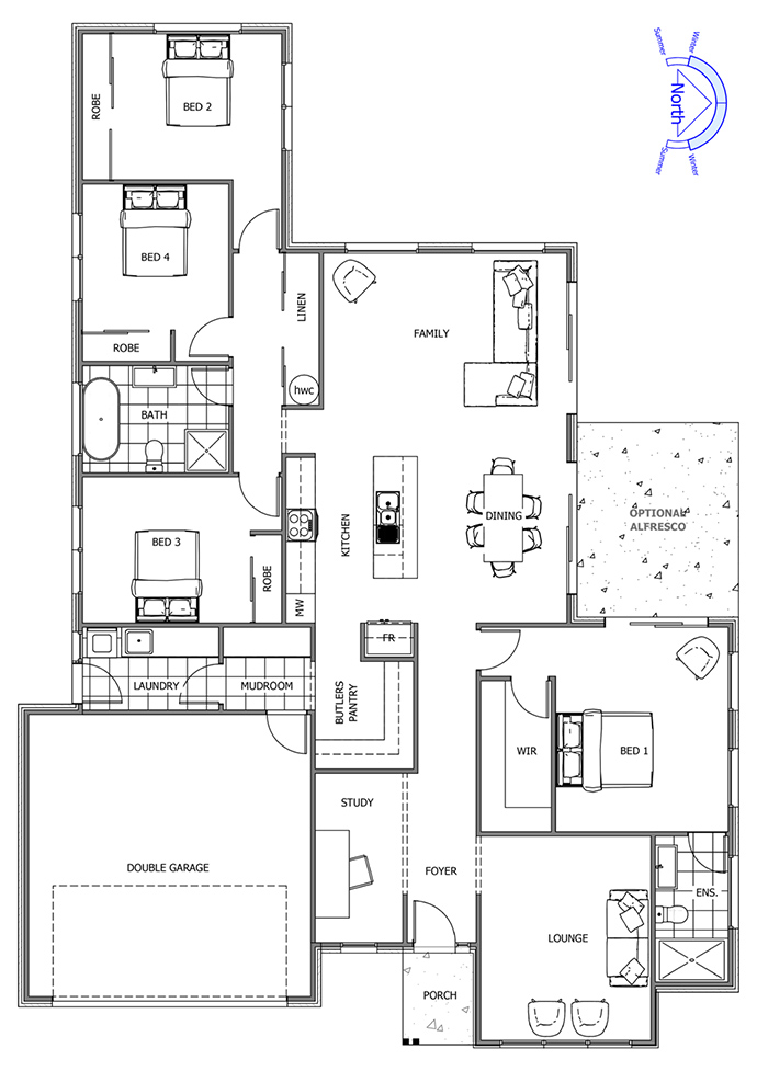 The Montrose is the ultimate crowd pleaser, combining an abundance of space and family friendly features, with sophisticated private zones. A large lounge and study at the front hides a spacious master suite tucked in behind for the ultimate in privacy. You will enjoy a large galley kitchen and butler pantry, with a laundry and mudroom flowing off the garage. Combined with the huge open plan main living area that catches an abundance of natural light, everyday living has never been so enjoyable. To the rear are the remaining bedrooms and family bathroom wrap this family package together.