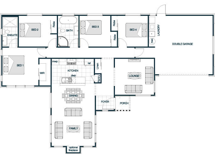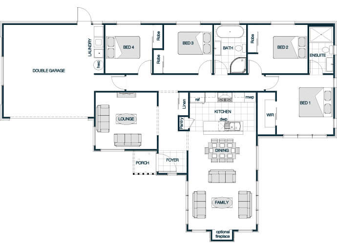 The Outlook Hip is a spacious and modern home designed to maximize comfort, light, and connection to the outdoors. With a total floor area of approximately 220m, it includes 4 bedrooms, 2 bathrooms, and a double garage, making it ideal for growing families or those who love to entertain.