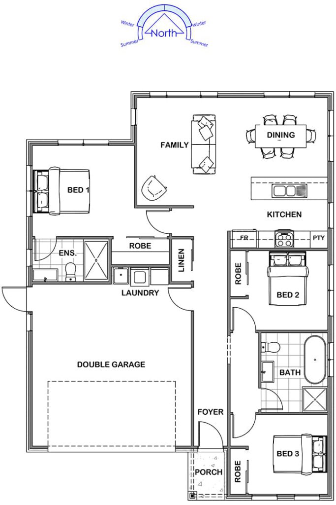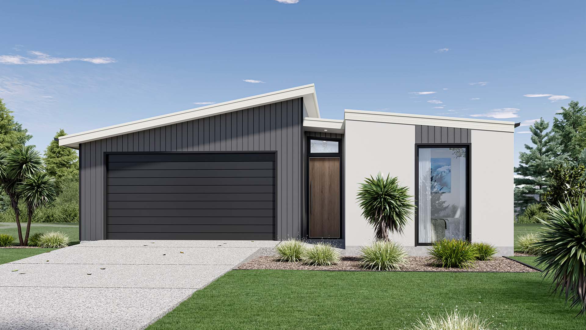 With a contemporary Mono-pitch roof, the Paramount has a bold, streamlined street presence. Step inside to a generous central living zone that flows directly into a modern galley kitchen. Two bedrooms and the family bathroom sit up front, while the master suite with ensuite and walk-in robe resides at the rear for added privacy. The integrated double garage ensures practicality and ease of access.