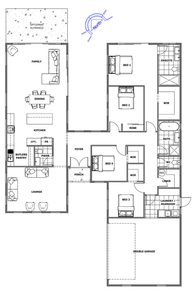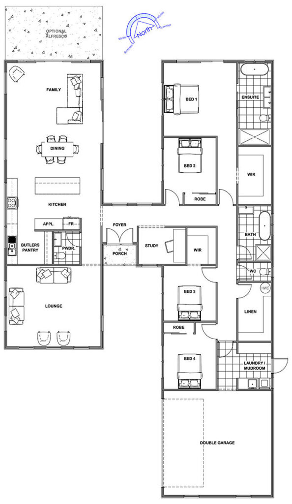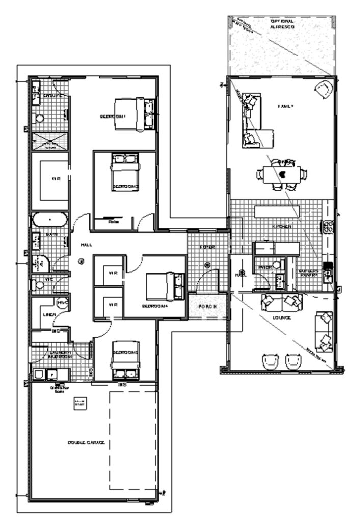 The Pavillion 2.0 Gable features a soaring gable roof design that delivers a balanced, timeless look, blending effortlessly into a variety of neighbourhoods. The interior layout focuses on well-zoned living spaces with a clear separation between social and private areas. The open-plan kitchen and living zones extend to an alfresco, ideal for casual dining and gatherings. The master suite is thoughtfully positioned for privacy and boasts a luxurious ensuite and walk-in robe. Three additional bedrooms are grouped around a shared bathroom and activity room, providing plenty of space for family growth and lifestyle flexibility.