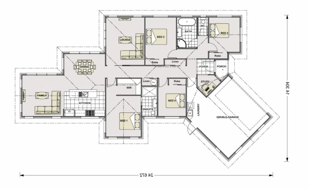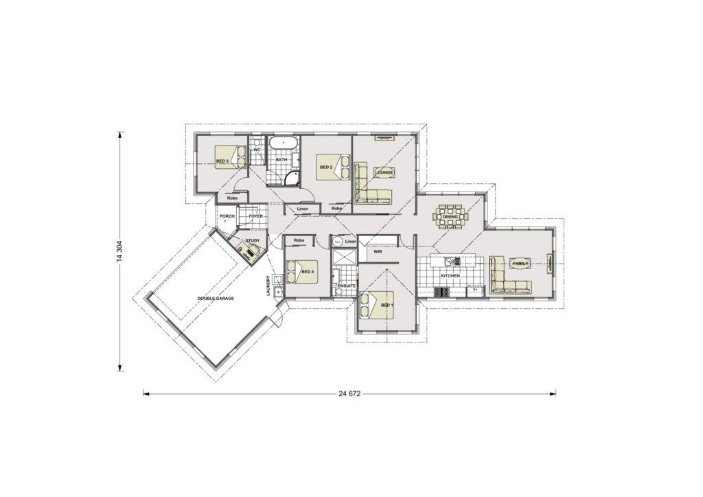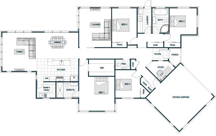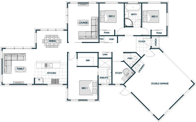 Embracing classic architectural charm, the Richmond Bay Gable Roof plan features a traditional pitched roof that adds character and visual interest to the home's exterior. Inside, the layout offers a spacious open-plan living area that connects the kitchen, dining, and lounge, fostering a sense of openness and connectivity. The bedrooms are thoughtfully positioned, with the master suite benefiting from an ensuite bathroom for added convenience. The gable roof design not only elevates the home's curb appeal but also allows for vaulted ceilings, enhancing the sense of space within.
