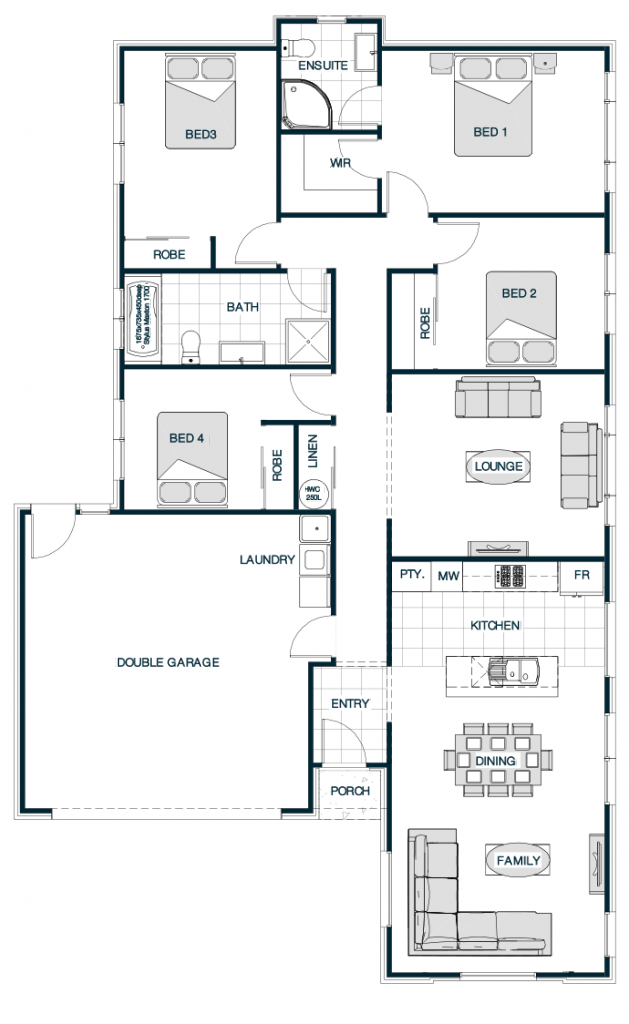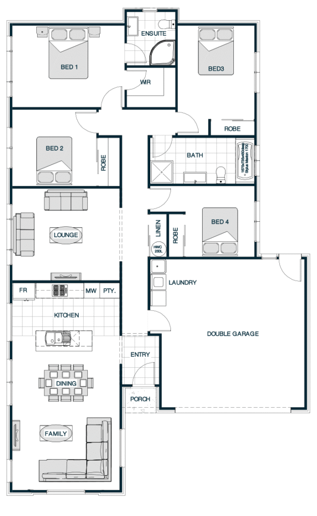 Embracing classic architectural charm, the Rothbury Gable Roof plan features a traditional pitched roof that adds character and visual interest to the home's exterior. Inside, the layout offers a spacious open-plan living area that connects the kitchen, dining, and lounge, fostering a sense of openness and connectivity. The four bedrooms are thoughtfully positioned, with the master suite benefiting from an ensuite bathroom and walk-in robe for added convenience. The gable roof design not only elevates the home's curb appeal but also allows for vaulted ceilings, enhancing the sense of space within.