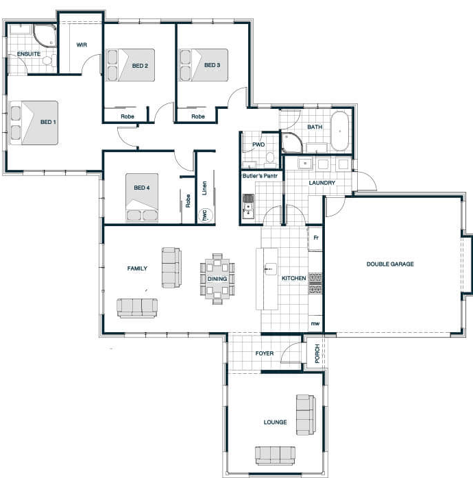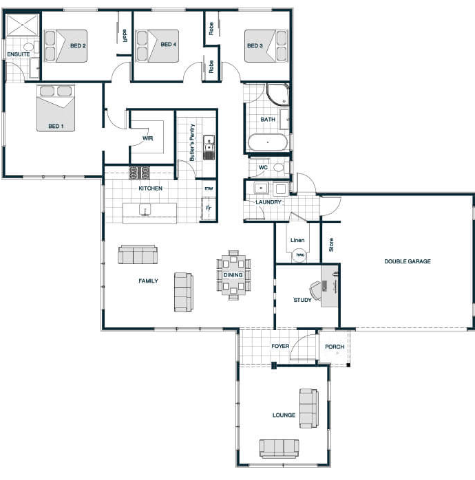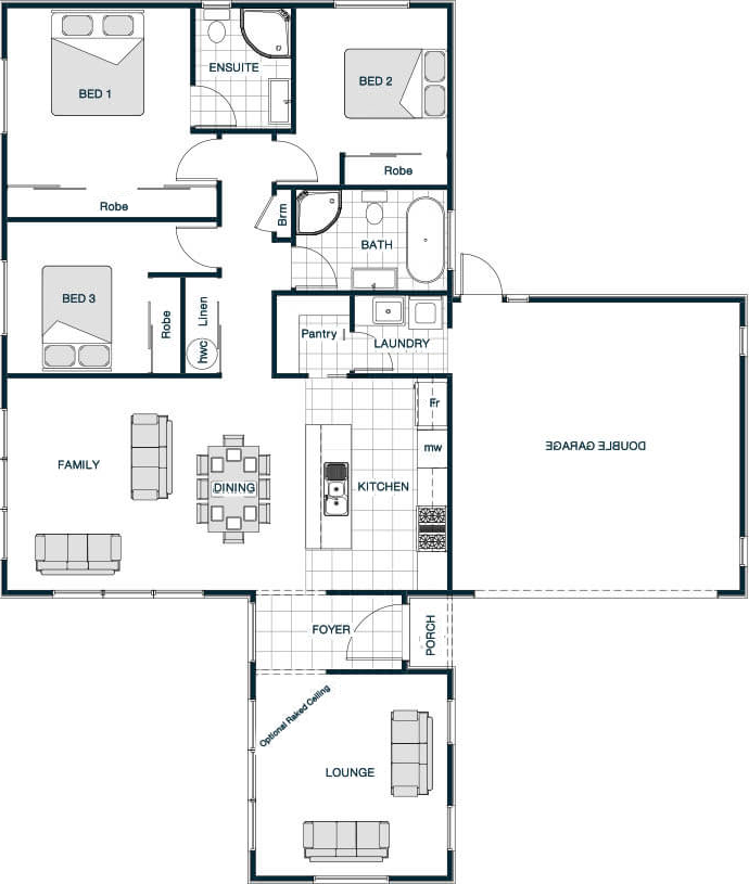 The Suffolk Gable Roof plan delivers classic charm with its pitched roof and inviting facade. Inside, vaulted ceilings add volume and openness to the large, connected living, dining, and kitchen spaces. The four-bedroom layout prioritizes comfort and privacy, featuring a master suite with ensuite and walk-in robe. This design blends timeless appeal with contemporary living for families seeking both elegance and practicality.