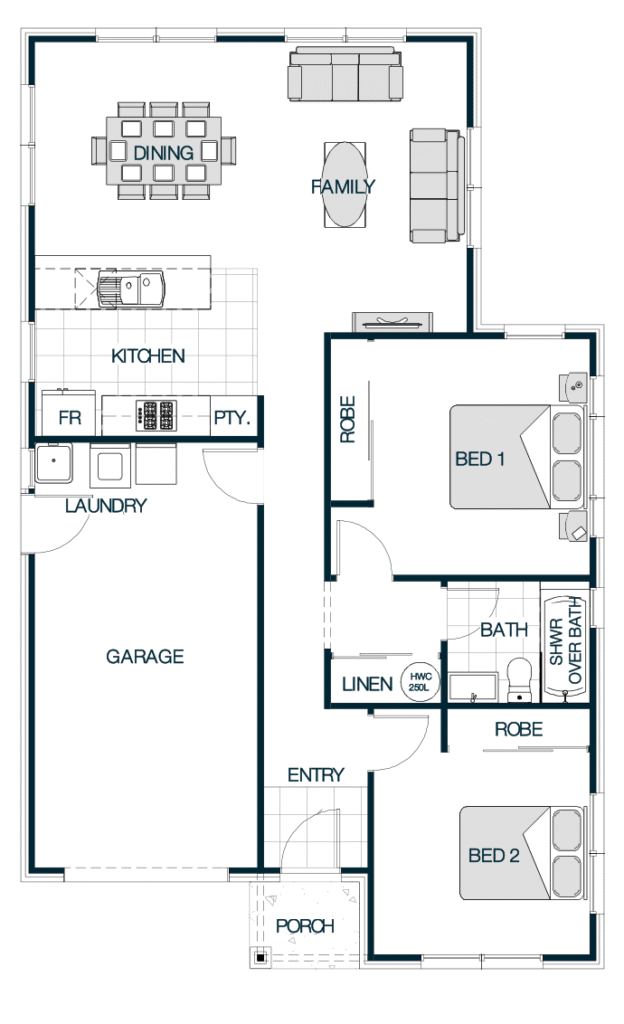 The Thames Mono Roof plan features a sleek, single-slope roofline that perfectly complements its contemporary design. Natural light floods the open-plan kitchen, dining, and living spaces, creating an inviting and airy atmosphere. With three bedrooms including a master suite with ensuite and walk-in robe, the layout balances modern style with practical family living. The mono roofÃs clean lines boost curb appeal and contribute to energy efficiency.