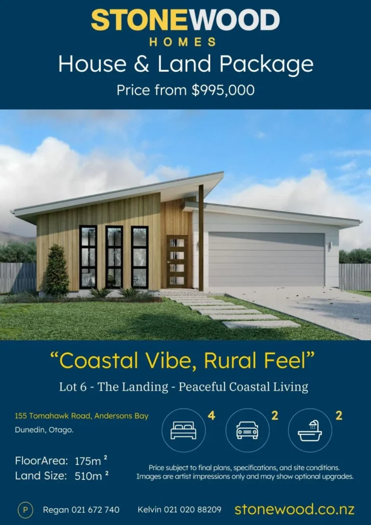 Your future begins here — The Landing, 155 Tomahawk Road, Andersons Bay. Contact us today to explore available sections and discover how Stonewood Homes can bring your new home to life.